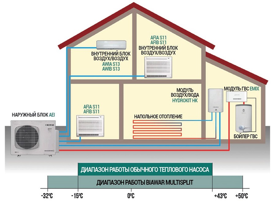 Еще один плюс в том, что организация работы одного прибора в условиях экстремального понижения температуры отнимает меньше времени, средств. Например, если приходится дополнительно обогревать внешний блок при аномальных климатических воздействиях.