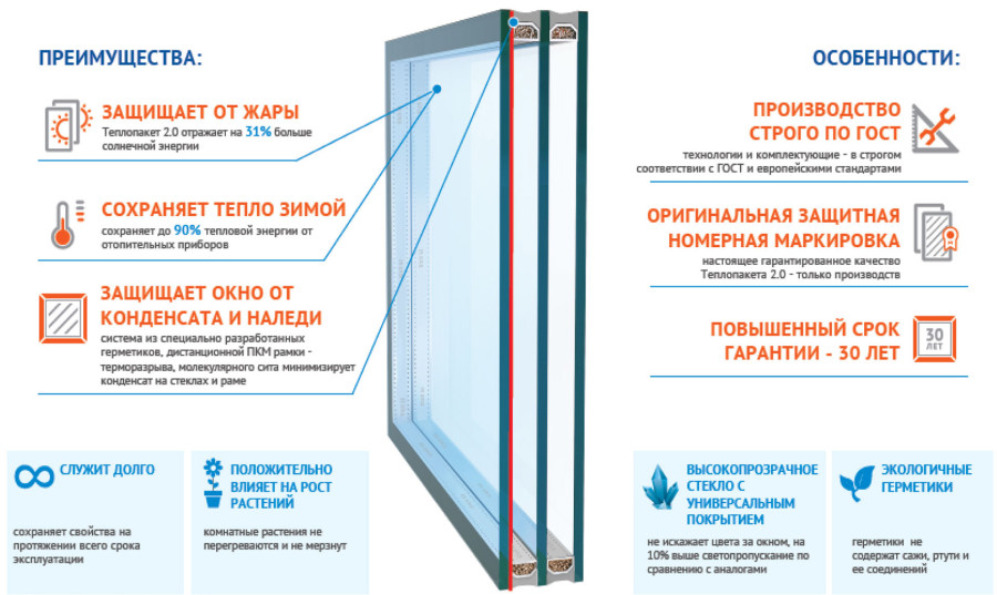 - Теплопакет 2.0 – новый стандарт современных окон. Изготовлен из специально подобранных комплектующих, имеет улучшенный внешний вид и характеристики!
