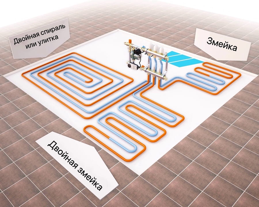Плюс «змейки» в том, что можно распределять зоны нагрева. Например, обходить мебель или сантехнику. Преимущество «улитки» — более равномерный нагрев всей площади.
