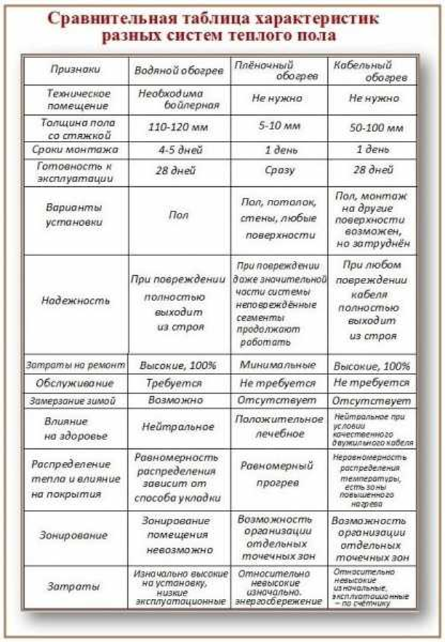 Разумеется, учитывается вопрос бюджета – чем более прогрессивна и эффективна система обогрева, тем дороже выйдет ее покупка. Зато эффективность обогрева в процессе эксплуатации существенно сократит расходы на снабжение энергией. Также стоит учитывать сроки монтажа, удобство ремонта и ряд других параметров, сведенных в таблицу ниже.