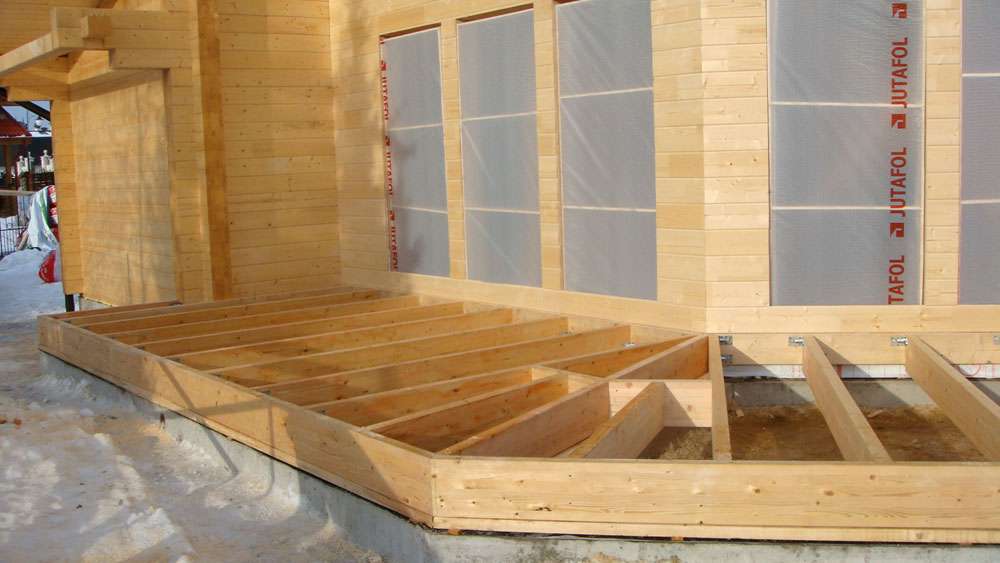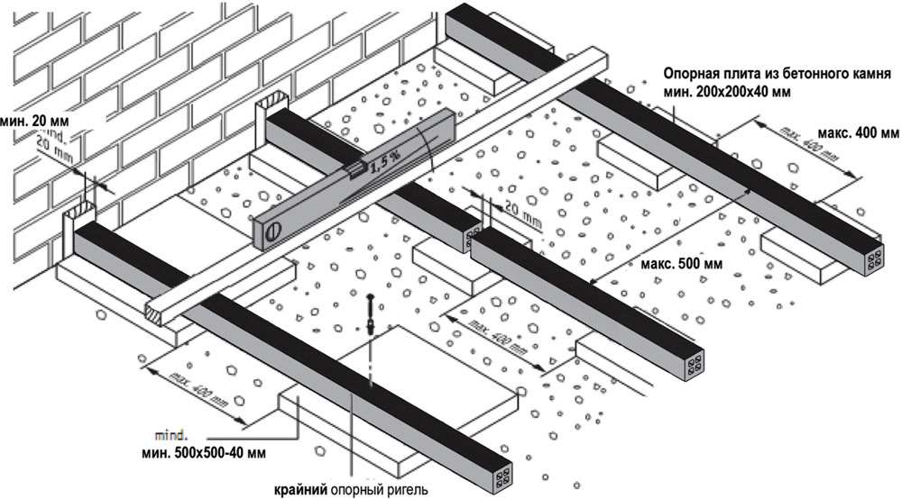 При установке материала во влажной среде между досками оставляют зазор в 4-6 мм для стока воды. В местах примыкания лаг к стене дают зазор в 15-20 мм. Опорному бетонному основанию придают уклон в 1-2 градуса в направлении от здания.