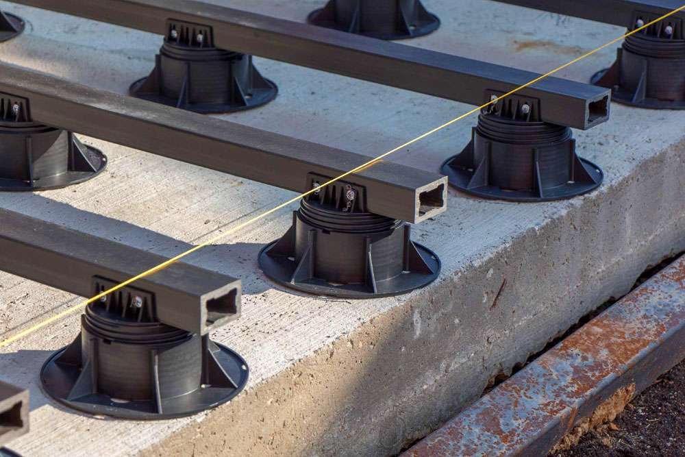 Правильный монтаж террасной доски требует не только жесткого и ровного основания, но и укладки на нем опорных лаг из композита или натуральной древесины. Их шаг находится в пределах от 35 до 50 см и выбирается в зависимости от толщины доски (чтобы не было прогиба).
