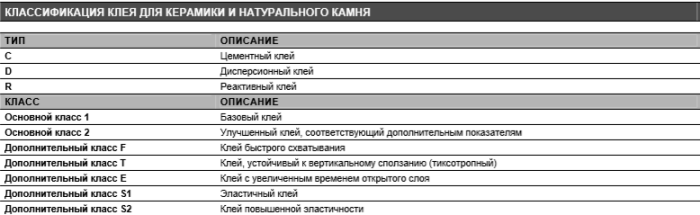 По стандарту EN 12004 и EN 12002 клей для укладки плитки классифицируют исходя из химического состава и особых характеристик: