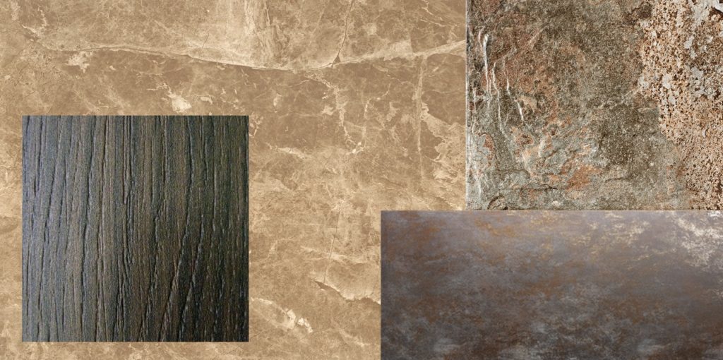 Также существует возможность имитации металла, мрамора, гранита и других природных материалов. Такой подход позволяет использовать любую фактуру в облицовке помещений. Особенно это полезно в том случае, если клиент хочет натуральный камень, но использовании его невозможно, например, из-за большого веса, тогда можно прибегнуть к использованию тонкого керамогранита. Большой формат, легкость состыковки, минимальные затраты труда на монтаж позволяют добиться непрерывной текстуры.