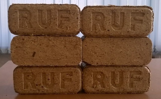 - Топливные брикеты РУФ (RUF) — самые известные, они производятся исключительно прессованием опилок по немецкой технологии и имеют характерный внешний вид. В большинстве случаев евробрикеты РУФ прямоугольной формы, по своему виду они похожи на обычные небольшие кирпичи. Маленький размер спрессованных кирпичиков позволяет загружать их в топки любого объема. Специалисты считают брикеты РУФ наименее крепкими, способными крошиться в руках. В действительность низкосортные евробрикеты так и крошатся, а вот продукция с приемлемым качеством более твердая.