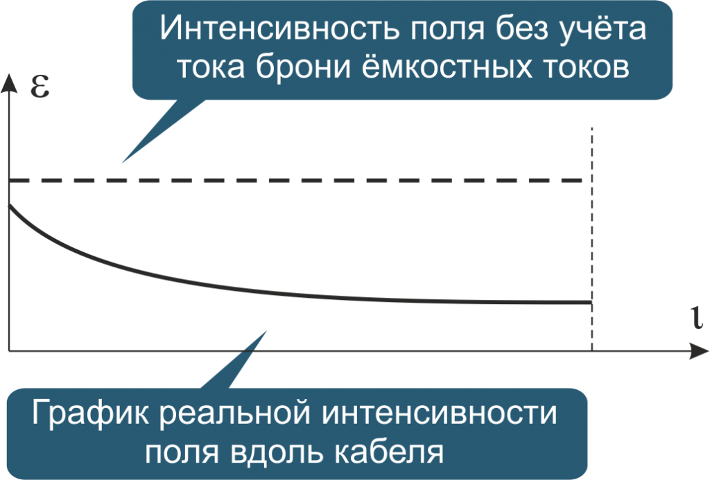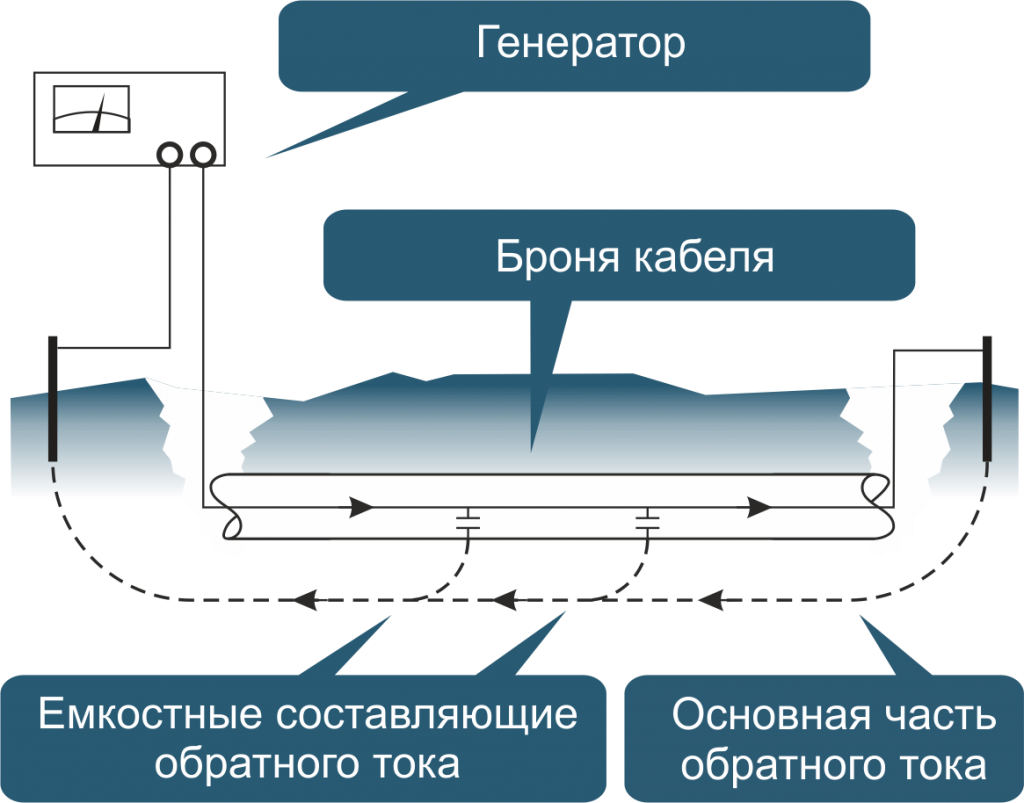 Выходной ток генератора протекает в основном через присоединенную неповрежденную жилу кабельной линии и замыкается через землю. Вокруг кабеля возникает поле, интенсивность которого слабо зависит от удаления от начала кабеля. Это поле можно прослушивать на протяжении всей линии и тем самым определять ее местонахождение. Однако некоторая часть обратного тока может протекать не через землю, а через броню или экран кабеля. Это приводит к некоторому общему ослаблению интенсивности поля. Причина ослабления поля в том, что направления токов в жиле и оболочке кабельной линии противоположны и поля от них частично компенсируются. Кроме того, происходит постепенное ослабление интенсивности поля вдоль кабельной линии. Это обусловлено емкостным током, величина которого уменьшается при удалении от начала кабеля. На рисунке показана интенсивность магнитного поля над кабелем при подключении генератора по схеме «неповрежденная жила — земля».