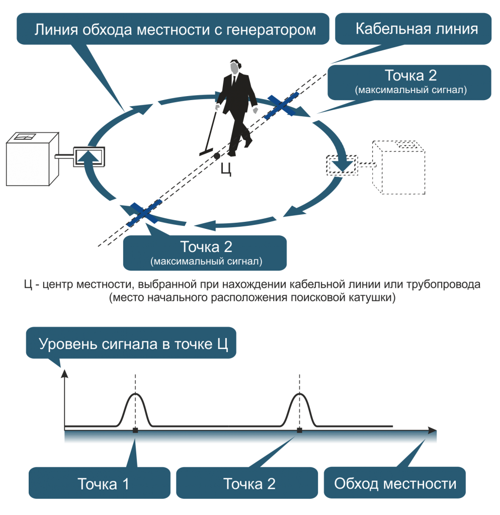 Согласно рисунку можно рекомендовать следующую методику определения местонахождения кабельной линии или трубопровода: