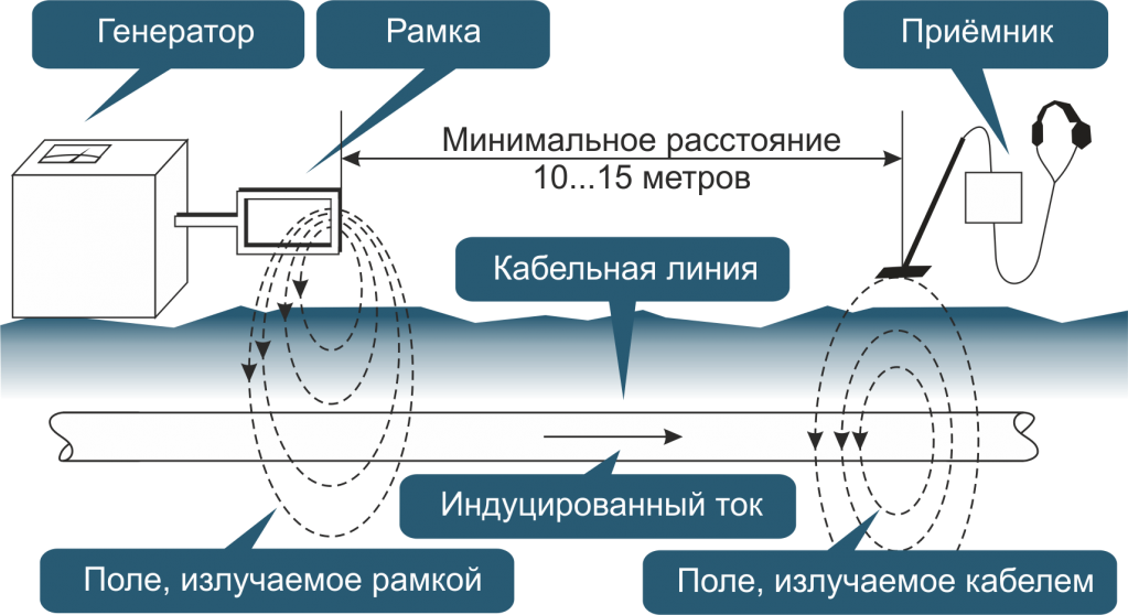 Выходной ток генератора протекает по виткам индукционной рамки и вызывает появление магнитного поля, проходящего через окно рамки. Это поле проникает через землю и охватывает кабельную линию или трубопровод. В кабеле или трубопроводе начинает протекать индуцированный ток. Этот ток в свою очередь вызывает появление магнитного поля, которое опоясывает кабель (трубопровод) и может быть принято индукционным приемником. Таким образом, появляется возможность обнаружить кабельную линию (трубопровод) без непосредственного подключения к ним генератора.