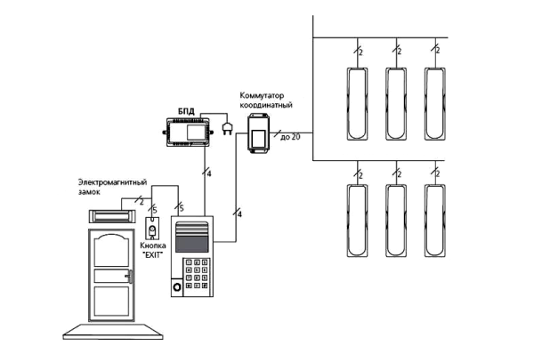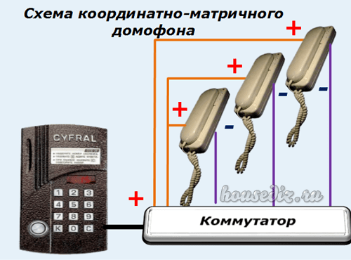 Подключить трубку домофона самостоятельно на данный тип не составит труда. Здесь вся работа заключается в передаче сигнала на специальный коммутатор, который при получении вызова обрабатывает его, и за счет наличия специальных ключей отправляет сигнал вызова на необходимое абонентское устройство.