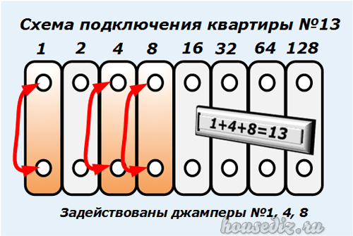 Например, любимая нами квартира №13 вводится замыканием перемычек №1, 4, 8.