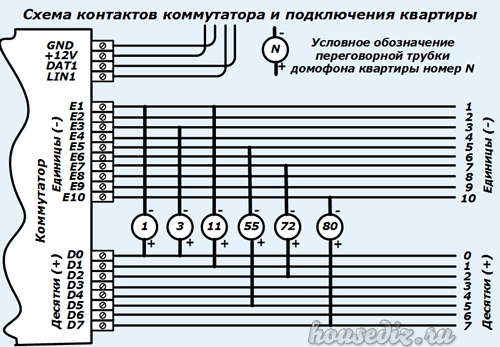Для подключения оборудования квартиры плюс ее трубки монтируют на контакт десяток, а минус — единиц. Например, квартира №72 подключается минусом на Е7, а плюсом — D2.