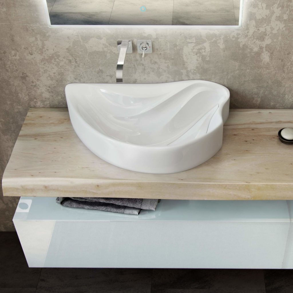 - Раковина неправильной овальной формы, рассчитанная только на установку на тумбе или столешнице. Имеет отверстия для арматуры: сливное, перелив и отверстие для установки смесителя.