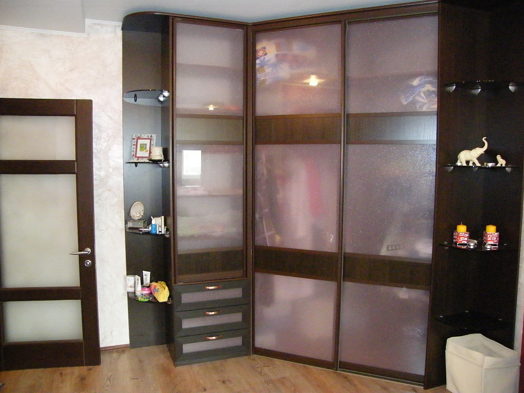 Неординарно будут выглядеть фасады для углового шкафа-купе из стекла. Здесь может использоваться полупрозрачный, матовый или окрашенный в любой цвет материал. Конструкция с такими дверями имеет нетривиальный внешний вид, если на поверхность наносится пескоструйный рисунок.
