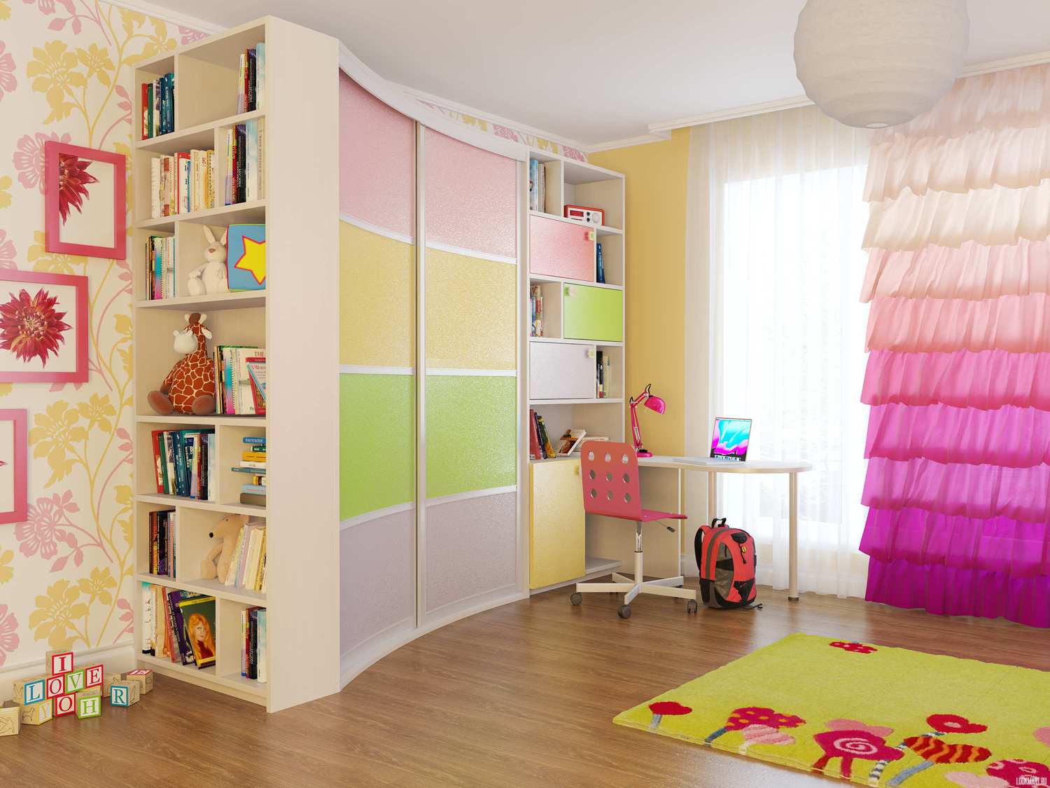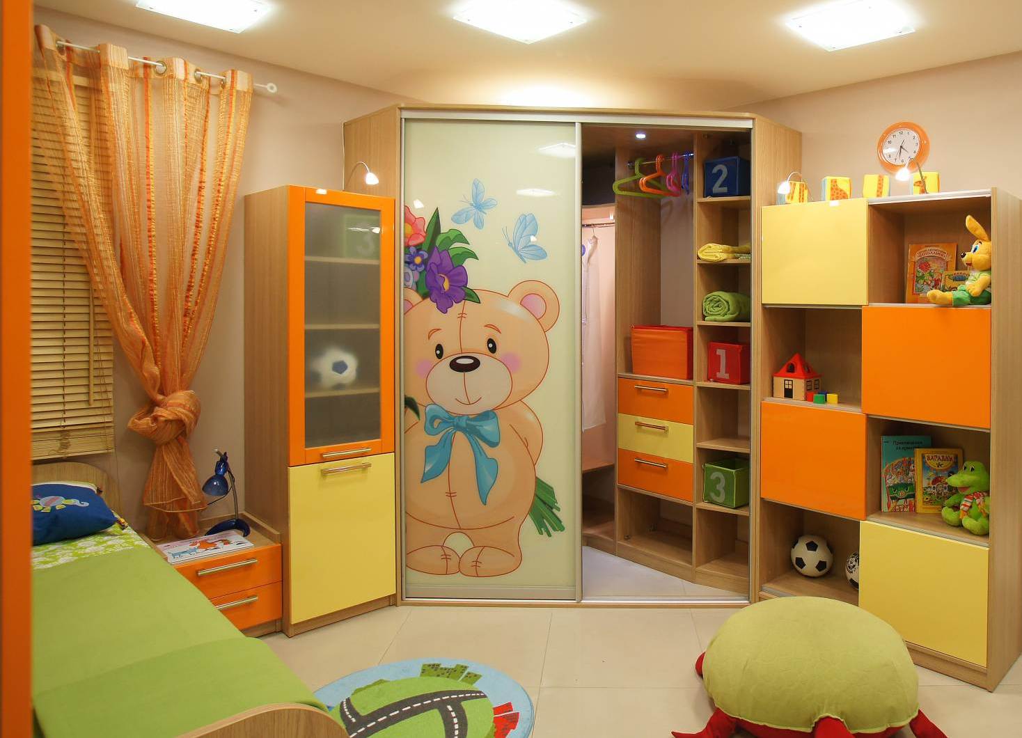 Настоящая радость и для детей и для родителей – угловой шкаф – купе в детской комнате. Родителям будет удобно убираться в комнате, на верхние полочки можно положить зимнюю одежду ребенка и постельной белье, а на нижних полках можно поместить встроенные выдвижные полочки, в которые малыш будет складывать свои игрушки, книжки, конструкторы.