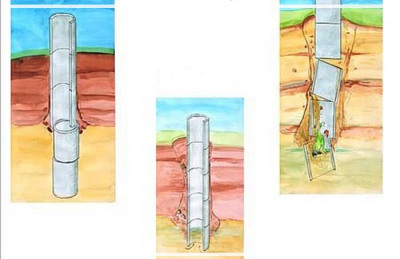 - После этого продолжают копать тоннель и опускать в него установленную и скреплённую часть ремонтной колонны. Новые кольца наращивают сверху.