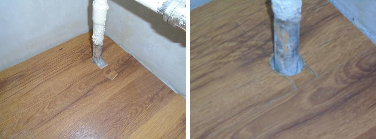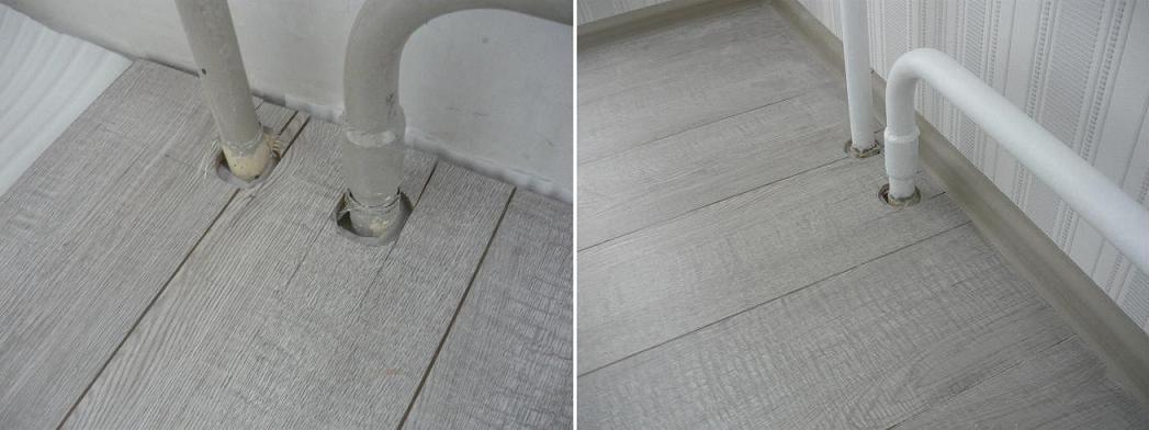 Если из пола выходят трубы, их нужно обойти с зазором, аналогично стенам. Зазор следует делать не менее 10 мм. Вначале