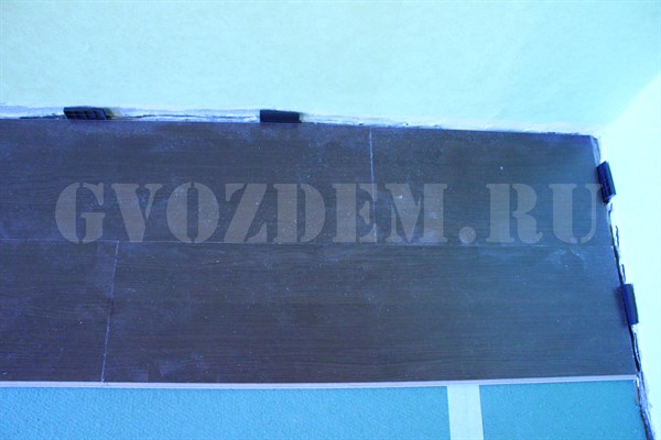 Шаг 3. Затем брусок прикладывается к одной из панелей ламината, плотно приклеивается к ней за счет скотча.
