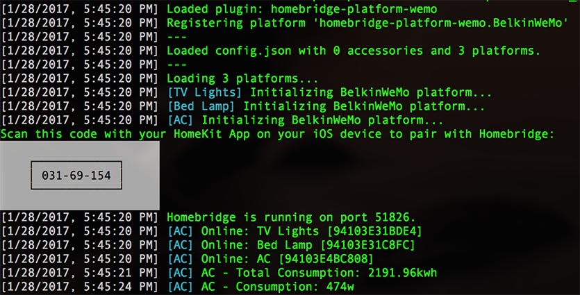 Сам HomeBridge будет восприниматься HomeKit как отдельный независимый блок. Для его подключения потребуется добавить устройство в приложении Дом на iOS, отсканировав выводимый в командной строке QR-код либо введя отображаемый там же номер.