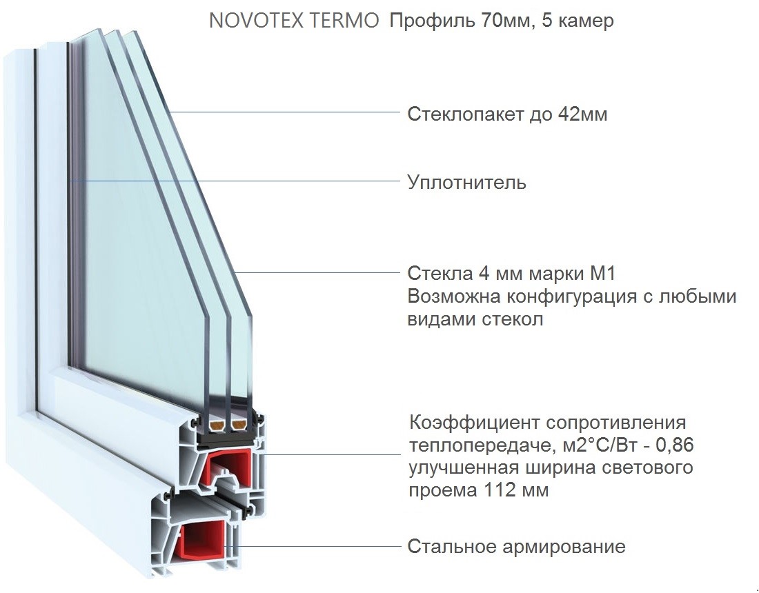 Современная система «Novotex» – универсальный комплекс, с тремя контурами уплотнения. Профили изготавливаются с помощью новейшей технологии «CaZn». Монтажная сторона имеет впадины шириной до 80 мм и 6 мм – внутренние камеры профиля уплотнения.
