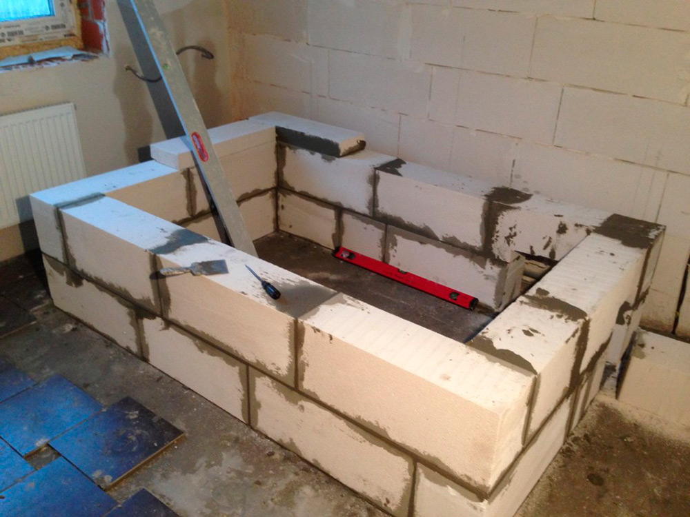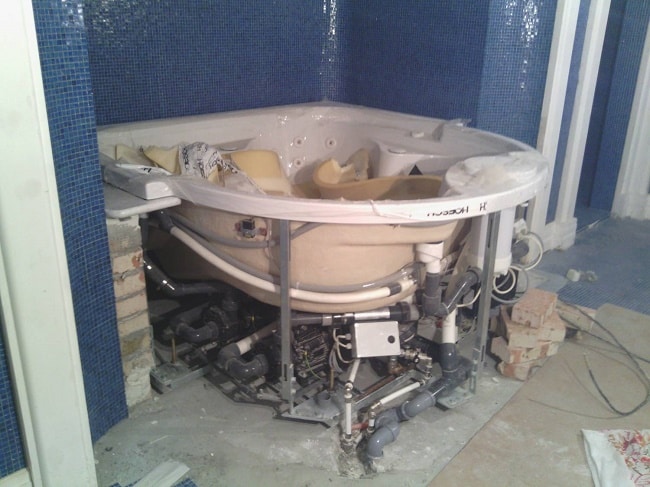 Перед началом рабочего процесса нужно полностью подготовить ванну. Для этого стены покрываются плиткой, за исключением мест, в которые будет «топится» борт джакузи. Аналогично устанавливается и напольное покрытие.