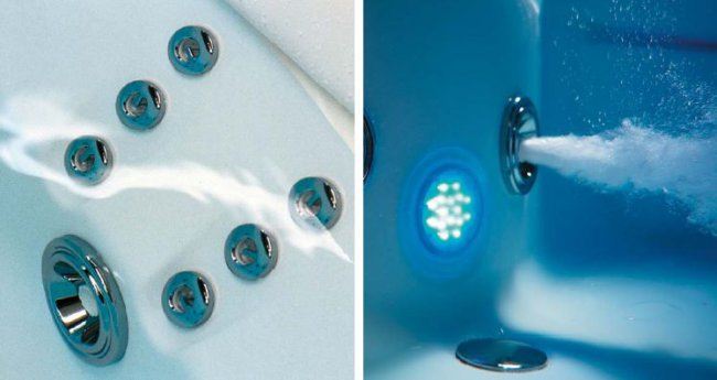 А некоторые джакузи могут похвастаться наличием системы аэромассажа. При аэромассаже воздух, нагнетаемый аэрокомпрессором, выходит через специальные аэромассажные форсунки, расположенные внизу ванны. Они дают воздушно-пузырьковые струи, которые повышают общий тонус мышц. Также есть разновидности джакузи только с аэромассажной системой, без гидромассажа.