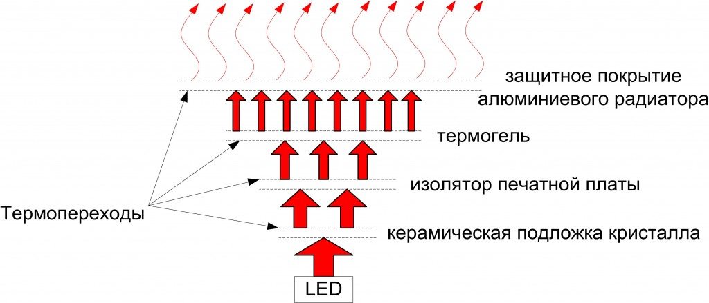 Другим обязательным элементом, входящим в конструкцию светильника на основе светодиодных ламп, является радиатор. Все дело в том, что при работе светодиодная лампа выделяет тепло, требующее обязательного отведения.