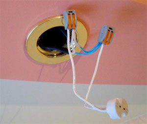 Крепление потолочных светильников получается прочным, надежным, но не разъемным. Более простой способ подразумевает использование разъемов с определенным количеством входов, к которым подключаются провода. Кроме того существуют специальные приспособления – клеммники, они стоят дороже, но провода в этом случае задача, как подключить споты на потолке, решается быстро, легко и прочно. Можно воспользоваться клеммными колодками с винтовым соединением, они также обеспечивают надежное подключение, но для подачи напряжения на все провода необходимо установить дополнительно перемычки на задействованные клеммы.