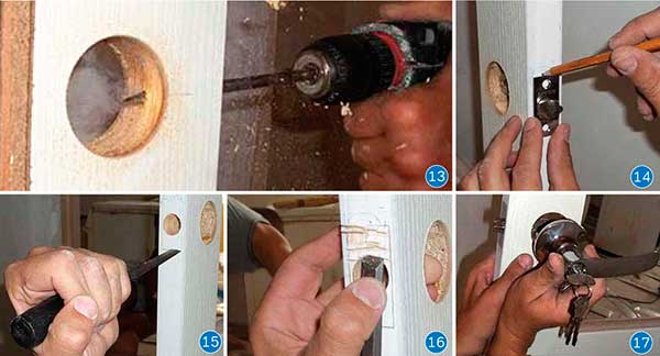 В торце двери отверстие под защелку высверливается перьевым сверлом подходящего размера или небольшой коронкой. При необходимости выемку можно расширить стамеской.