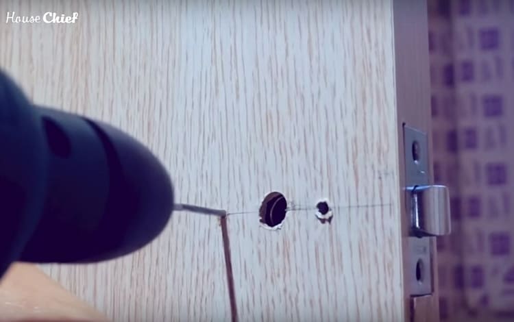 Следующим шагом является высверливание отверстий для квадратного стержня и фиксирующего механизма. Для установки личинки делают углубление в полотне двери с помощью перьевого или витого сверла, диаметр которого соответствует ширине механизма. Чтобы точно определить, насколько погружать сверло, на него клеят изоленту. Поэтому при создании полости должна остаться пометка сверху, чтобы не погружать инструмент ниже маркера.