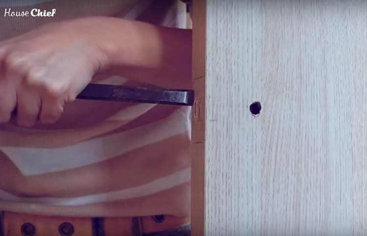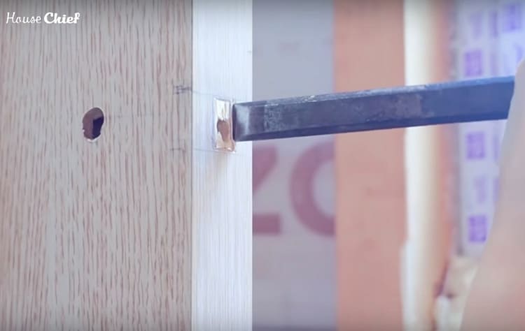 Когда отверстие намечено, наступает время буквально ювелирной работы. Потребуется стамеска и молоток.