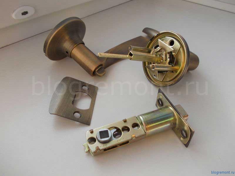 Монтаж завершается установкой механизма, внутренней накладки и планки на лутке. Механизм ручки вставляется в углубление так, чтобы совпали отверстия. После этого продевают квадрат и надевают на него рычаги или нобы. Последней устанавливают накладку на квадратный стержень и фиксируют ее специальным винтом. Защелку закрывают другой накладкой.