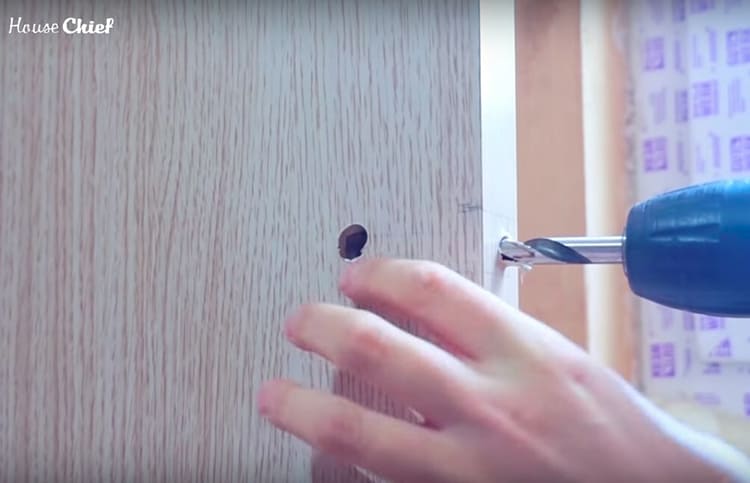 Выполнив разметку, просверлите в полотне двери отверстие под ручку при помощи коронки, надетой на сверло диаметром 6 мм.