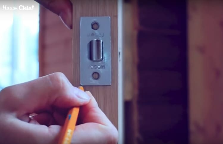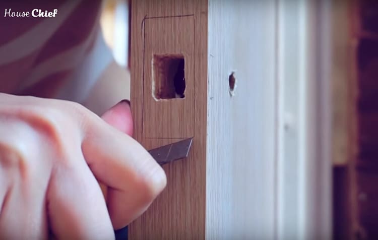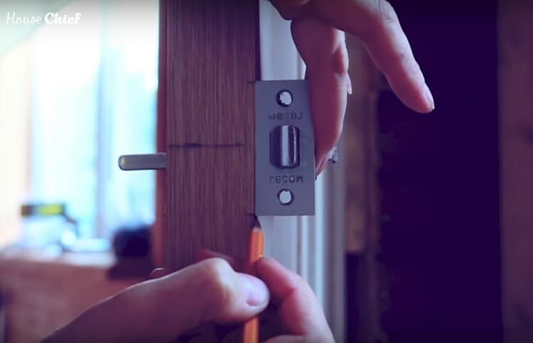 Затем в отверстие в торце следует вставить механизм защелки и обвести контур планки. Она должна устанавливаться заподлицо с поверхностью, поэтому под нее придется выполнить углубление при помощи стамески. У шпонированной двери в отмеченном месте предварительно снимается слой шпона.