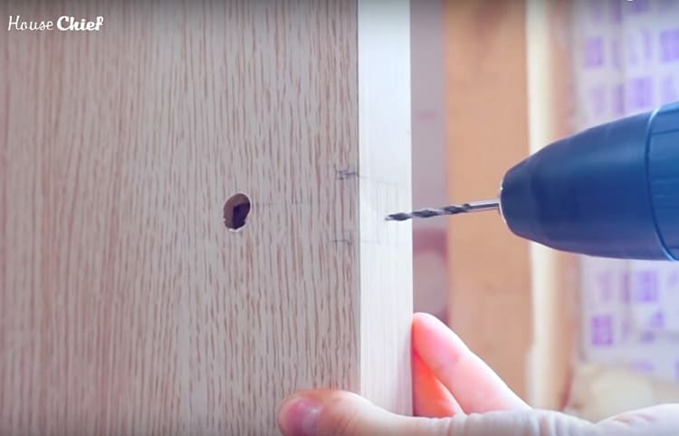 Важно направить сверло так, чтобы оно шло строго перпендикулярно полотну. Небольшой наклон – и отверстие уйдёт в сторону. Сверлить нужно не насквозь