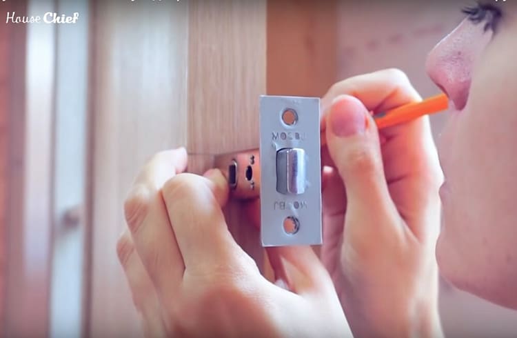 Затем делается разметка для язычка. Замок прикладывается к дверному полотну. При этом начерченная линия должна проходить по центру отверстия. При помощи карандаша отмечается нижняя и верхняя часть планки. То же самое проделывается для установки корпуса замка. Далее на торце полотна проводятся прямые линии. Это делается при помощи угольника. Углубление для механизма выбирается ручным фрезером. Срезать больше, чем необходимо, не рекомендуется. Для этого на внешнюю сторону разметки снизу и сверху должна быть наклеена малярная лента. Она станет своеобразным ограничителем. Затем в инструмент вставляется другая фреза, которая подходит к размеру планки. Далее настраивается необходимая глубина. Она должна соответствовать толщине планки. По центру аккуратно делается углубление. Далее необходимо провести подготовку гнезда для корпуса замка. Прямая линия при помощи фрезера проводится строго по центру разметки. Затем дрелью делаются намеченные отверстия. Остатки древесины выбираются при помощи молотка и стамески. Стенки посадочного места для замка выравниваются. Необходимо проверить, насколько хорошо подходит туда механизм. Далее производится установка ручек и самого замка.