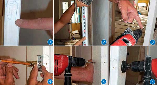 Начать следует с разметки на дверном полотне места, где будет врезана ручка с защелкой. Дверное полотно — это, собственно, сама дверь без дополнительных элементов, коробки, доборов и наличников.