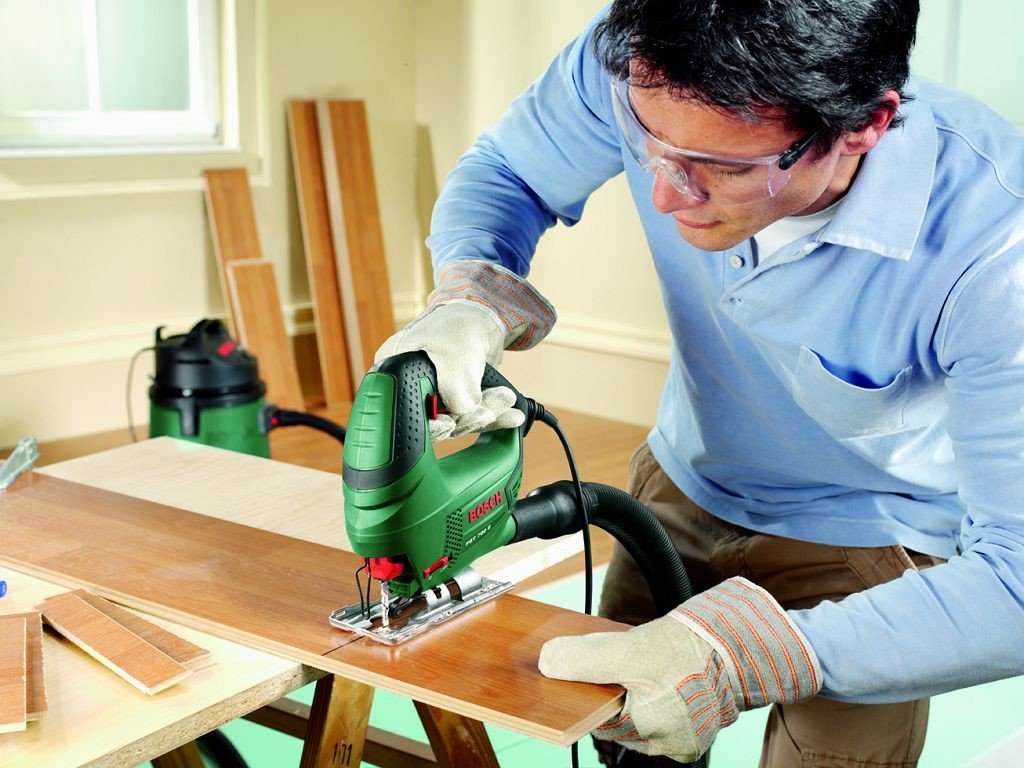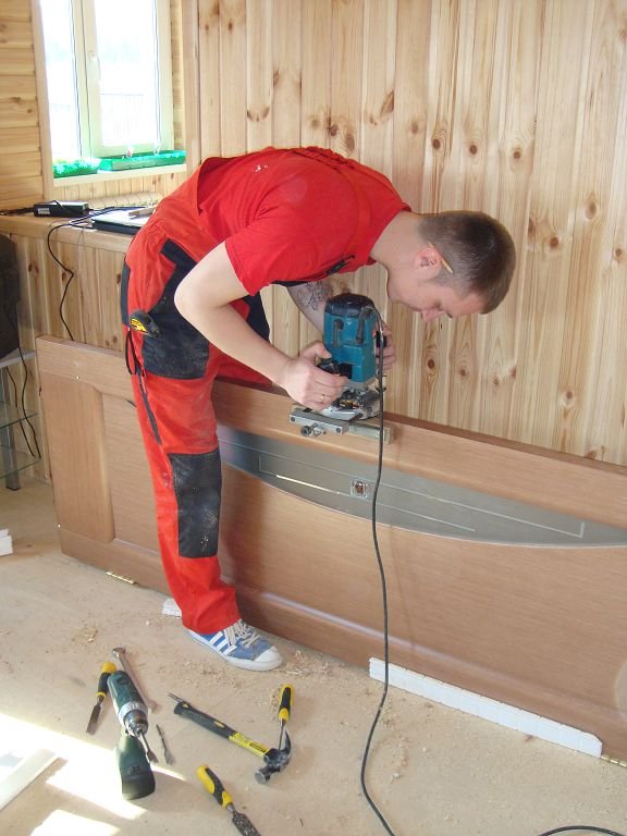 Электролобзик. Основное предназначение инструмента при инсталляции межкомнатных дверей – распускание доборов, наличников. Применяется для обработки мест, труднодоступных для пил.