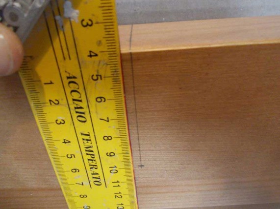 Необходимо продолжить разметку для ручки, или если говорить профессионально, для кноба. Для этого необходимо продолжить линию на торце далее на само полотно с обеих сторон. Делать это нужно строго перпендикулярно дверному полотну, используя угольник. Нелишним будет напомнить, что карандаш должен быть остро заточен.