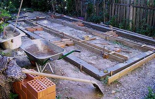 - Подготовленный котлован заливают свежеприготовленным бетоном, по ходу работ разглаживая и выравнивая поверхность.
