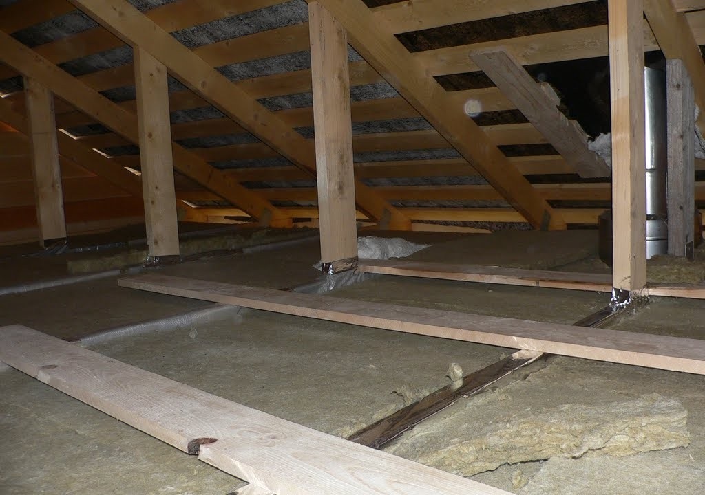 Перечисленные выше шаги являются обязательными и составляют процесс утепления потолка в бане. Однако для того чтобы слой теплоизоляционного пирога получился целостным, желательным является создание чернового пола на чердачном потолке. Его укладка производится поверх слоя гидроизоляции. Для его создания потребуется обрезная доска или же необрезная. Когда пол будет устроен, вы сможете спокойно передвигаться по чердаку и при этом не опасаться, что своими действиями повредите теплоизоляционный слой.