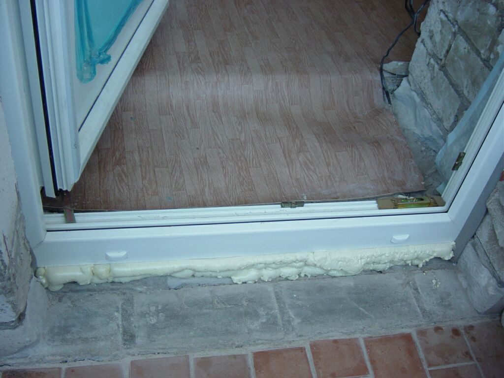 Во-первых, необходимо обеспечить полную изоляцию поддверного пространства – к сожалению, мастера при установке балконного блока часто «экономят» и не заполняют пустоту под нижней планкой монтажной пеной. Чтобы исправить это, достаточно лишь проделать работу за мастеров-монтажников.