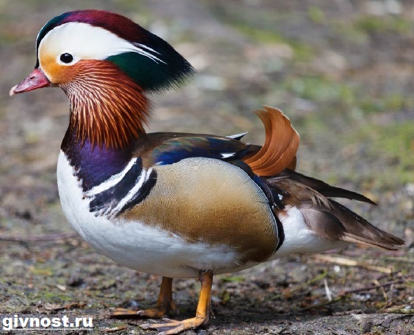 Эта птица относится к утиным. Судя по описанию утки мандаринки это пернатое небольших размеров. Вес утки не превышает 700 г. Птицу просто невозможно с кем-либо перепутать. У нее своеобразные форма и цвет оперения.