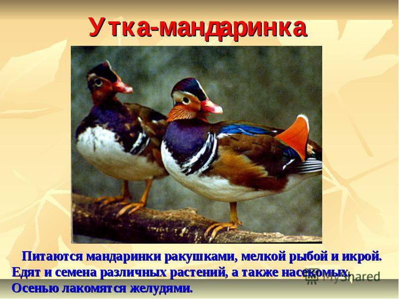 Презентация на тему: ” МАНДАРИНКА Систематическое положение птицы Класс – Птицы Отряд – Гусеобразные Семейство – Утиные Род – Лесные утки Вид – Мандаринка Мандаринка (Аix galericulata)” — Транскрипт: