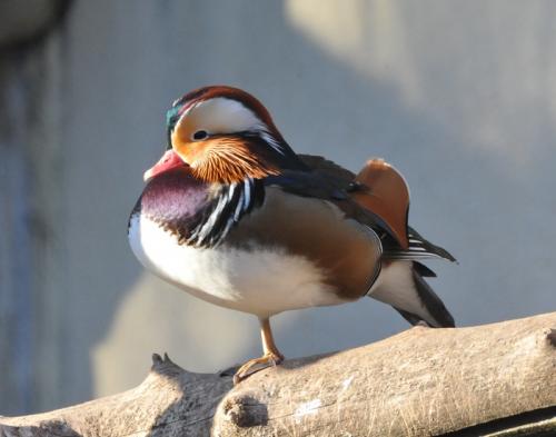 Птицы зоопарка – очень красивая разноцветная утка мандаринка чистит своё оперение