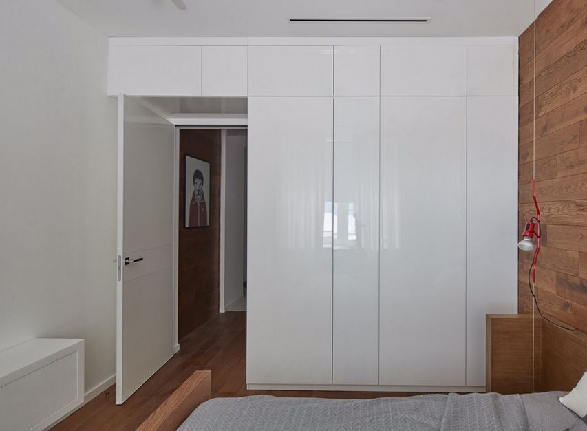 Чем меньше отдельно стоящих шкафчиков, полок, комодов — тем чище и объемнее смотрится интерьер. Если хотите визуально расширить пространство, создайте одну вместительную систему хранения за однотонным матовым фасадом без ручек, с системой push-to-open. Уберите пылесборные конструкции: навесные шкафы, полки, комоды вдоль стен — все это скрадывает пространство.