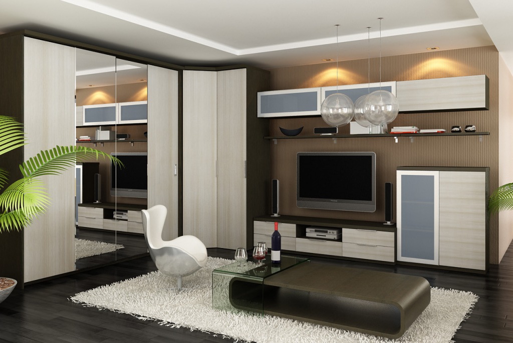 Телевизор, как правило, размещается на стене в окружении навесных деревянных полочек. Дизайнеры рекомендуют в небольших помещениях использовать в основном природные материалы – дерево, натуральные ткани, циновки. Стены оклеивают бумажными обоями, которые в любой момент можно заменить. Но чаще качественно штукатурят и наносят водоэмульсионную краску.