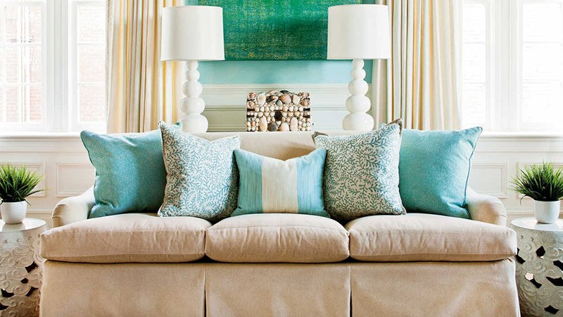 Увязка составляющих частей обстановки производится при помощи декоративных подушек и валиков, выдержанных в единой цветовой концепции интерьера.