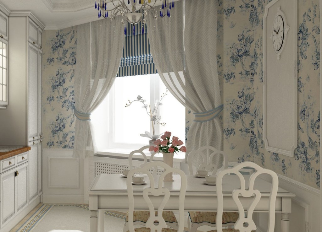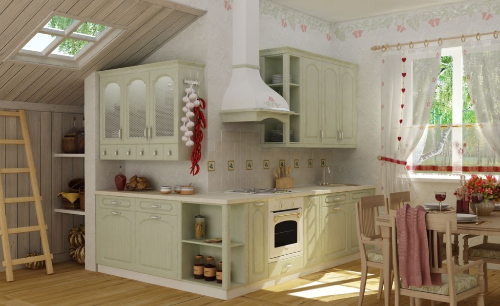 Кухонные помещения отзывчивы на создание деревенского стиля. Здесь уместны развешанные по стенам луково-чесночные косы, придающие особый колорит. Связки из стручкового перца и пучки трав под потолком. Окна, убранные ситцевыми занавесями в мелкий цветок и поверхности, укрытые кружевными салфетками ручного плетения, создают неповторимый уют деревенского дома: