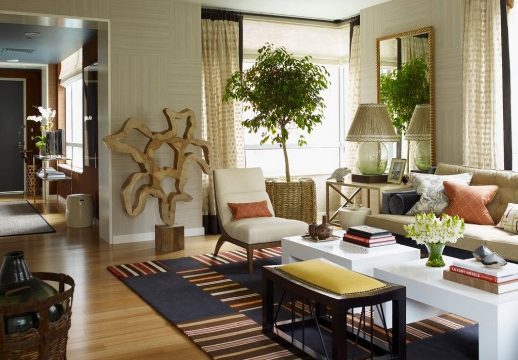 Симметрия предметов интерьера сделает помещение более привлекательным. Так, сохранится равновесие и баланс в комнате. Речь идет о симметрично установленных светильниках, диване и стульях с одинаковой обивкой, наряду с большим количеством живых растений. Такая гостиная будет смотреться гармонично и элегантно.