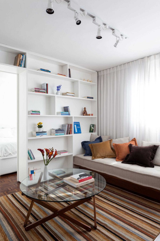 Интерьер каждой комнаты малогабаритной квартиры создается «с пристрастием», рассчитывая каждый квадратный сантиметр, с максимальным высвобождением полезной площади. Часть предметов с пола переносится на стеллажи или дополнительные навесные полочки.